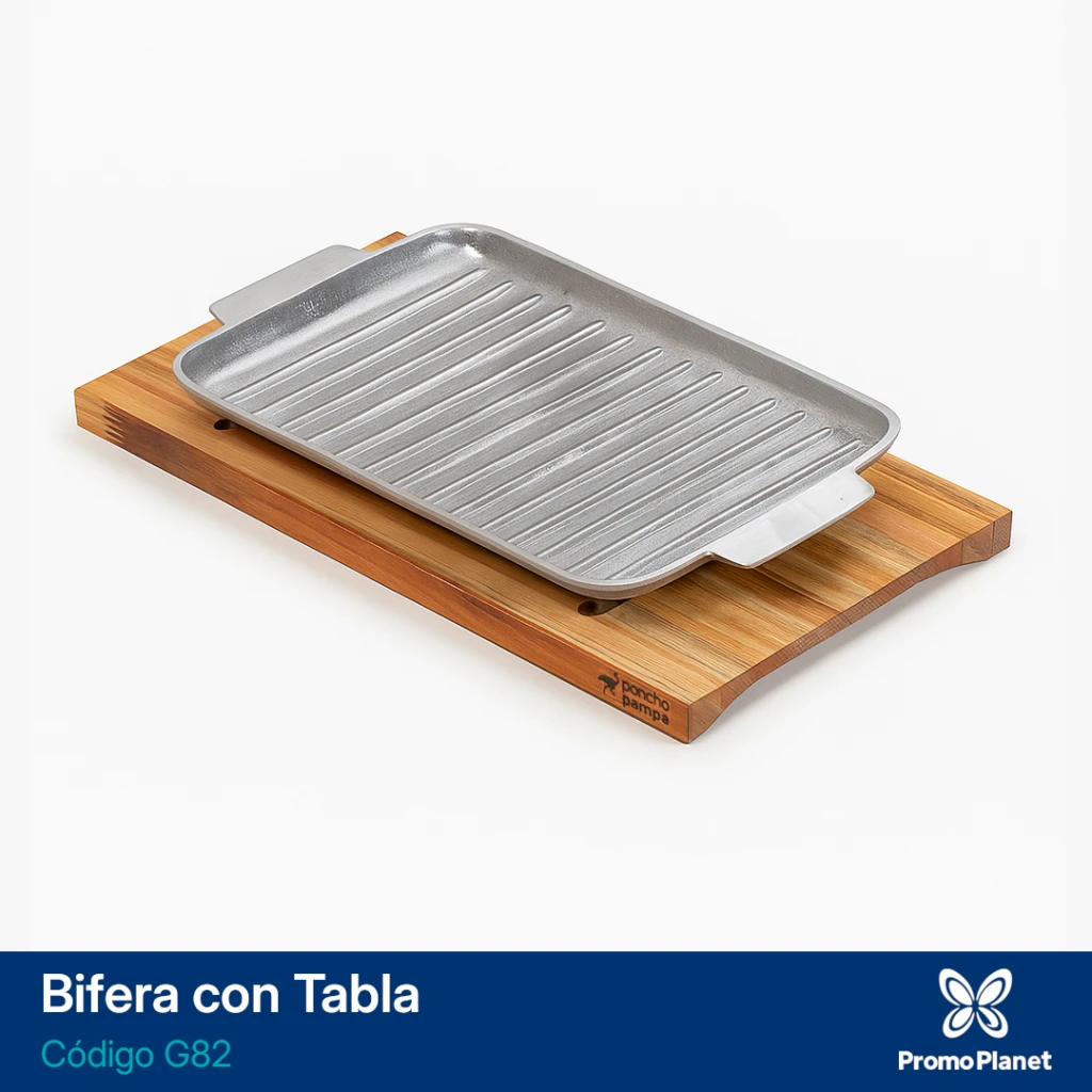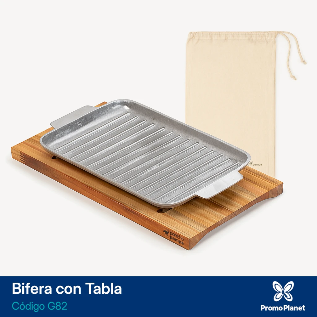 Incluye base de madera de eucalipto reforestado de 40 × 22 × 2 cm, resistente y de baja porosidad, ideal para servir en la mesa.