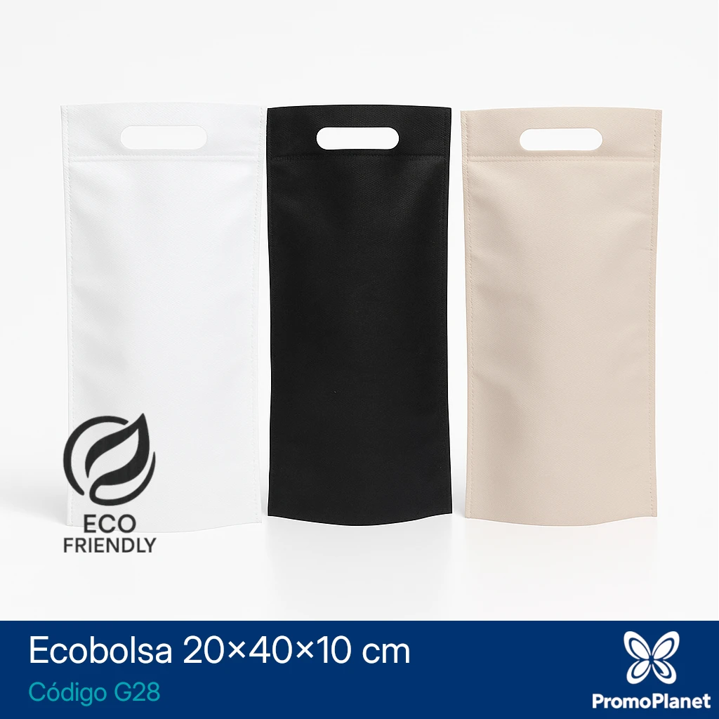 La ecobolsa G28 para botellas está confeccionada en friselina de 80 g, termosellada por ultrasonido para mayor resistencia.