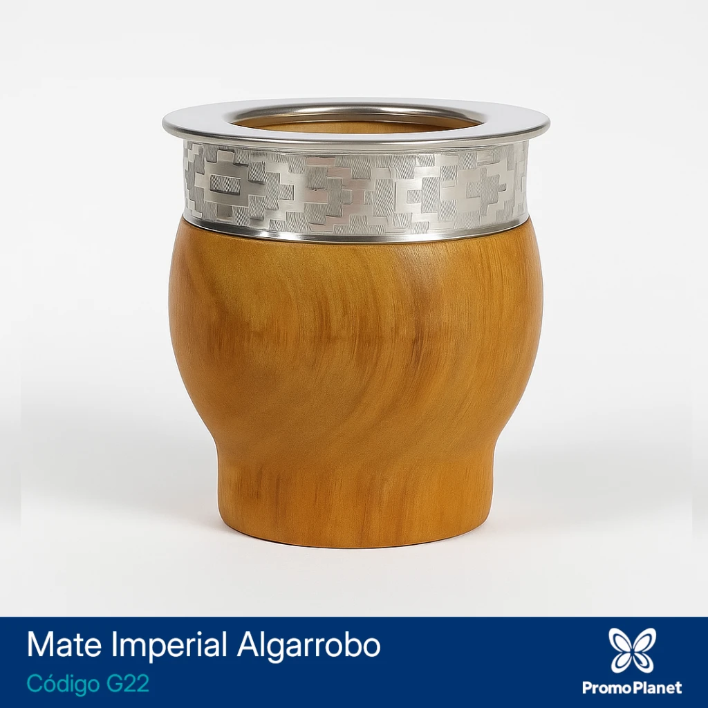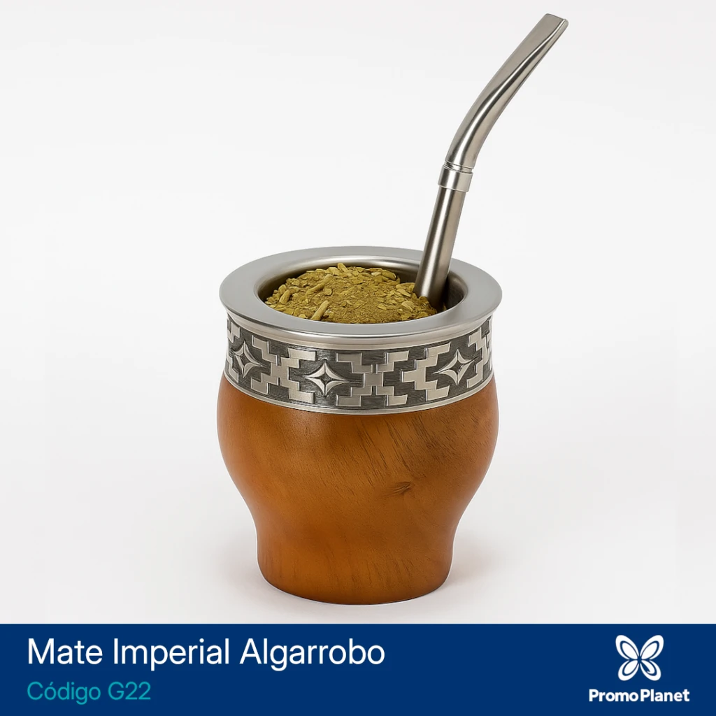 El mate G22 con diseño tipo Imperial está elaborado artesanalmente en madera de algarrobo con fleje de alpaca y virola de acero inoxidable.