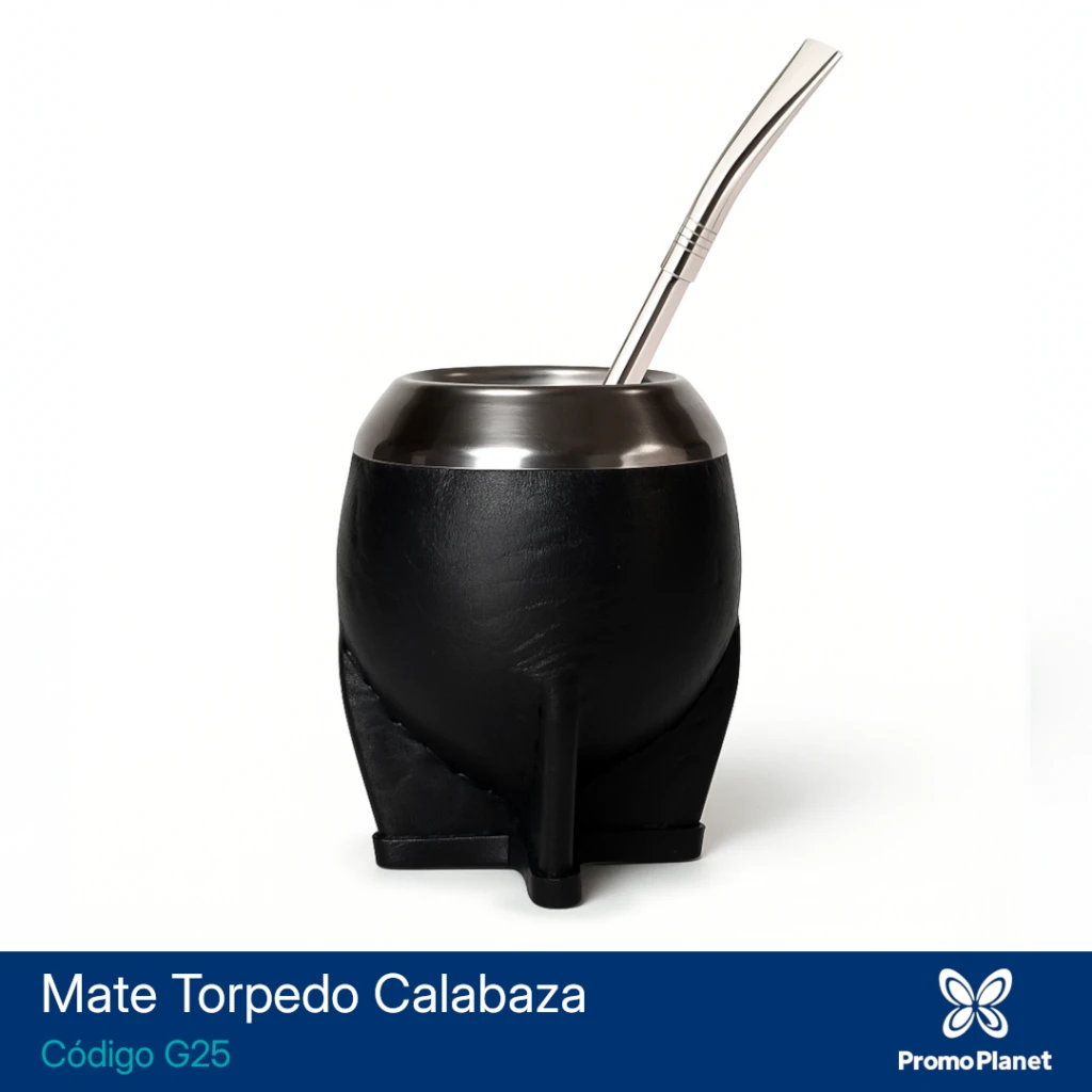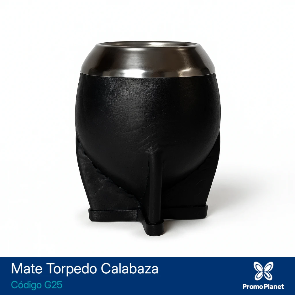 El mate G25 es un modelo torpedo elaborado con calabaza natural de paredes gruesas, forrado a mano en cuero vaqueta de 2,5 mm y cosido con hilo encerado.