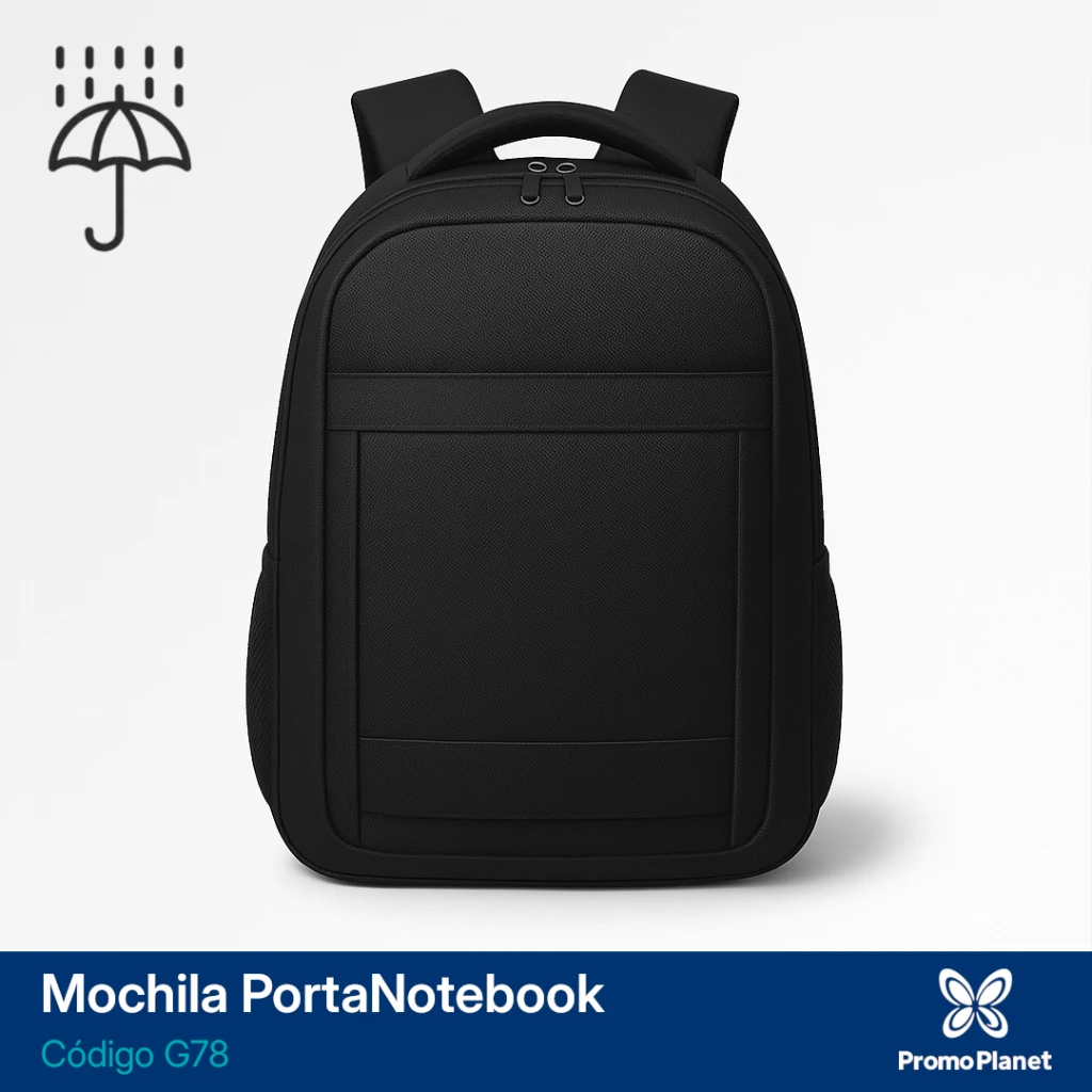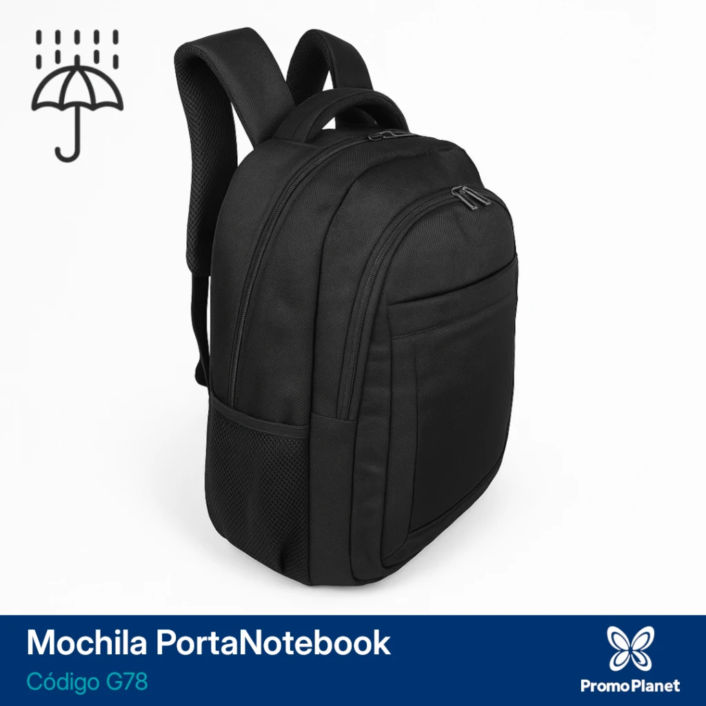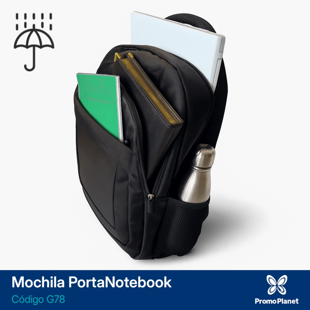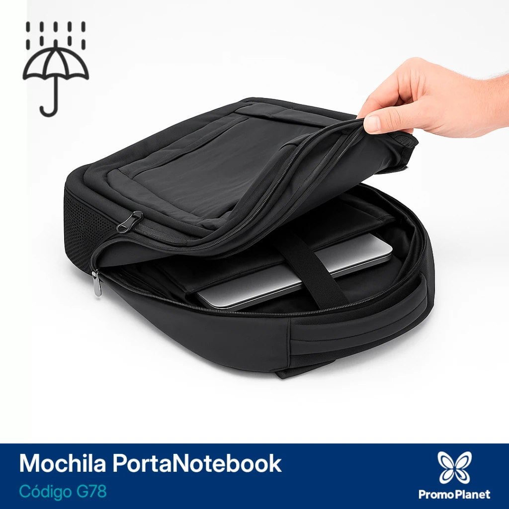 La mochila G78 está confeccionada en poliéster 1680D impermeable, con interior forrado y acolchado en poliéster 210T. Dispone de dos compartimientos con cierres dobles: uno frontal y otro principal con bolsillo porta notebook acolchado y sujetador con velcro.